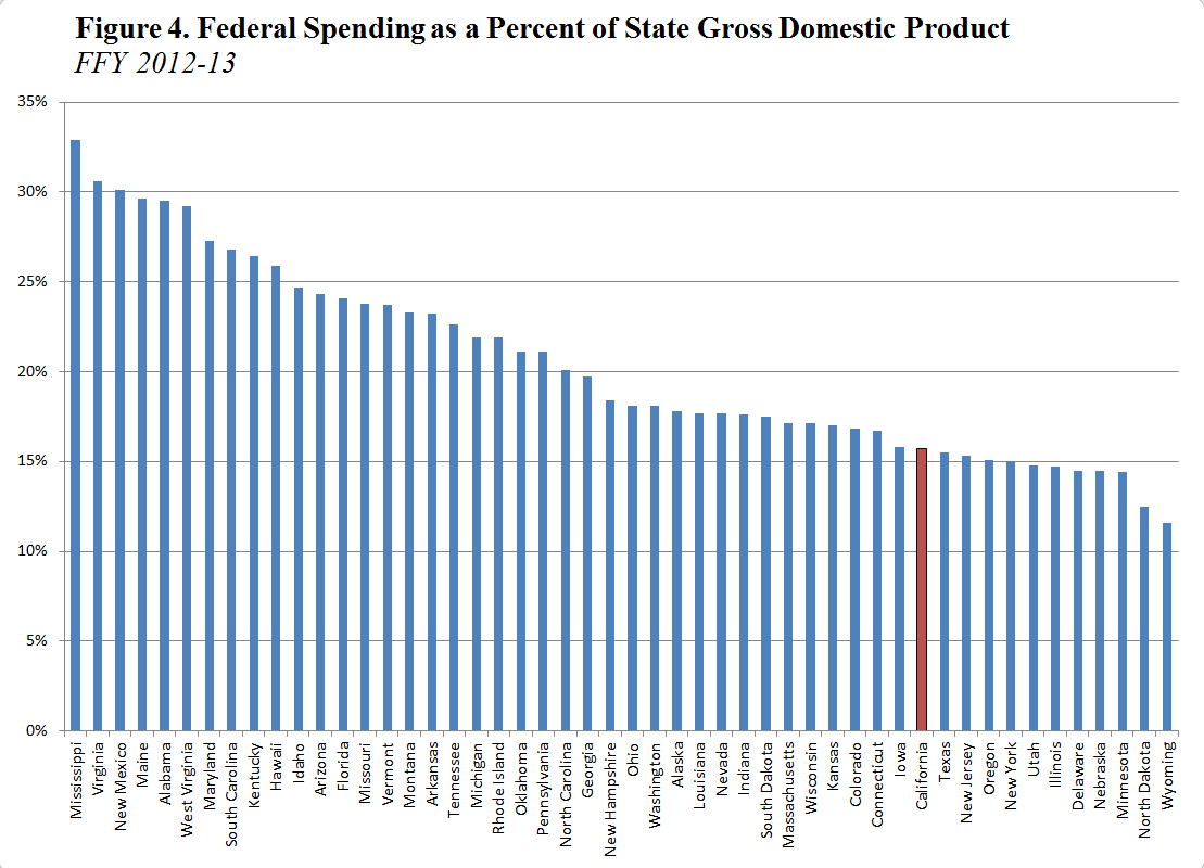 Compared to Other States, Federal Spending Also Accounts for Small Share of California’s Economy. As shown in Figure 4, federal funding is equivalent to less than 16 percent of California’s statewide economic activity, which is lower than the national average of 19 percent. These shares range from about 33 percent in Mississippi to less than 12 percent in Wyoming. Using this measure, California ranks 39th. We can explain this relatively low ranking with California’s relative economic size and wealth. California has a large economy in part because its population is large, but also because Californians have higher incomes relative to the rest of the United States. In 2012, for example, California’s income per capita was about $44,980, higher than the U.S. average of $42,693, ranking the state 8th overall.