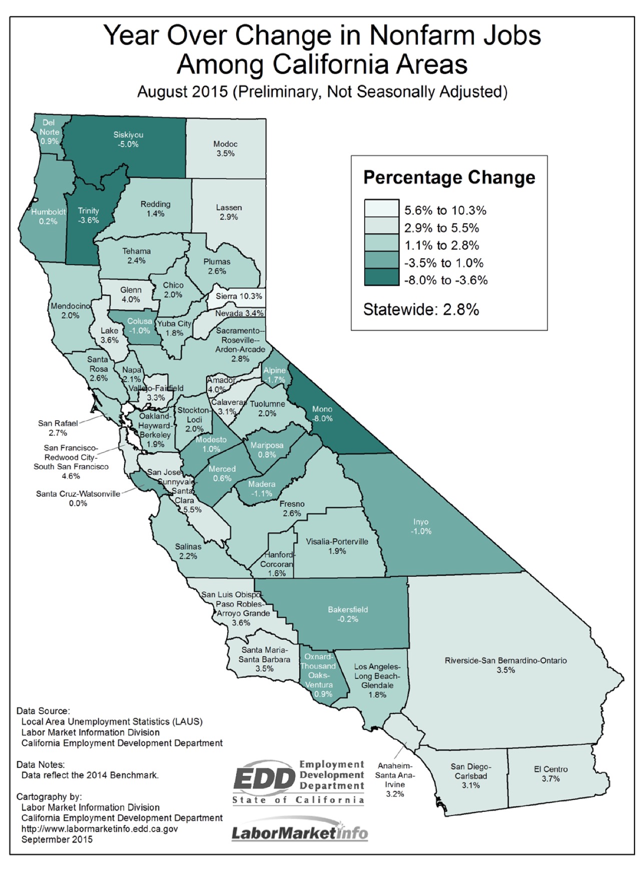 This morning, the U.S. Bureau of Labor Statistics (BLS) released state-level jobs and unemployment data for the month of August 2015. California's Employment Development Department (EDD) released more detailed data for California as well.