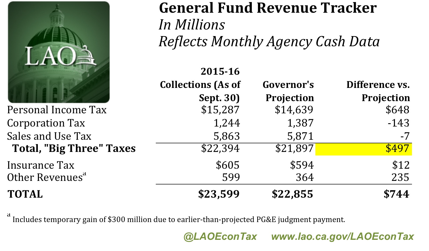 "Big Three" Taxes End September Around $500 Million Above Year-to-Date Projections. California's "Big Three" General Fund taxes (the personal income tax [PIT], the sales and use tax, and the corporation tax) combine to make up nearly all General Fund revenues. As of September 30, the Big Three taxes are running about $500 million ahead of the Governor's projections for the 2015-16 fiscal year to date, as shown above. Nine months remain in this fiscal year, including the current month of October.
