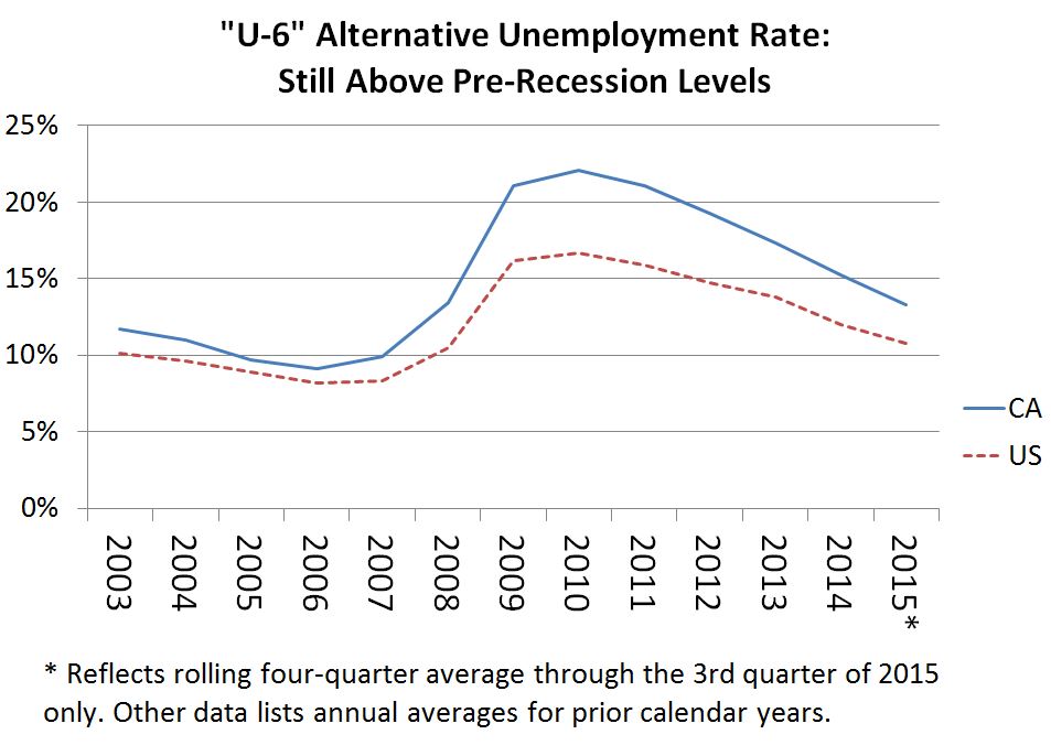 The official unemployment rate has been improving in California and the rest of the nation. In addition to this commonly reported measure of unemployment, there are other measures of "labor underutilization" in the economy, such as the "U-6" measure.