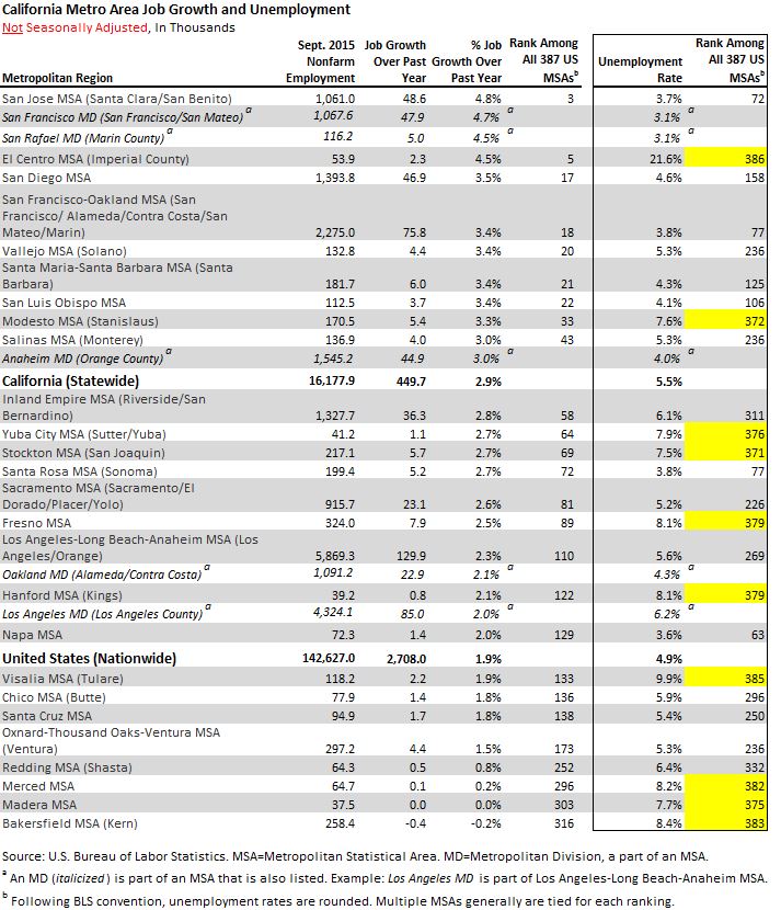 The U.S. Bureau of Labor Statistics (BLS) has released September 2015 jobs data for the nation's 387 metropolitan statistical areas (MSAs), as well as other metropolitan regions. We summarize the results for California's MSAs and metropolitan divisions (components of the San Francisco and Los Angeles MSAs) below. (Non-seasonally adjusted data is displayed.)