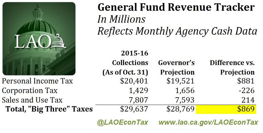 Year-to-Date "Big Three" Revenues $869 Million Above Projections. For the 2015-16 fiscal year to date, through the end of October, the "Big Three" General Fund tax sources combined are running $869 million above the administration's projections, as shown below. (This is an improvement from one month ago.)