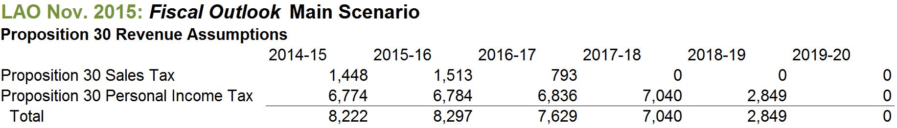 In conjunction with the release of the November 2015 edition of our office's Fiscal Outlook, we display below our office's updated estimates for the revenues of Proposition 30 (2012) under our publication's "main scenario."