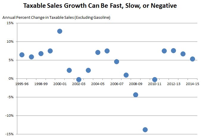 This rate reduction will affect the rate of General Fund SUT revenue growth in the 2016-17 and 2017-18 fiscal years. If taxable sales were constant from year to year, then this rate reduction would lead to a corresponding revenue reduction spread over 2016-17 and 2017-18. However, taxable sales are never constant from year to year: they usually grow and occasionally decline.