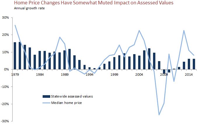 Home Prices Have Delayed Impact on AV. Changes in AV also tend to lag changes in home prices. During the recent housing boom and bust, home price growth peaked in 2004, while AV growth peaked in 2006. Similarly, home prices declines began in 2007 and bottomed out in 2008, while AV did not decline until 2009.
