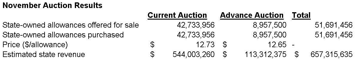 On November 24, 2015, the California Air Resources Board released summary results from the cap-and-trade auction conducted on November 17, 2015. Allowance prices were slightly higher than recent auctions, but, overall, the results were similar to recent auctions. Allowance prices were near the minimum price, and all of the allowances offered for sale were purchased. Based on the summary results, the state will collect $657 million in cap-and-trade auction revenue from the November auction. (The actual amount of state revenue will be determined in a few weeks and will depend on the future exchange rate between U.S. dollars and Canadian dollars. Please see the summary results for more details on the process for collecting proceeds.)