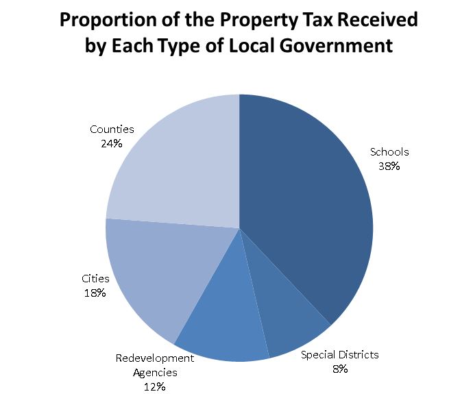 Schools Receive the Greatest Proportion of Property Taxes Due to Formulas From the Mid-1970s. As seen in the figure below, schools receive almost 40 percent of statewide revenue from the 1 percent tax. While this varies across the state, in many counties, schools receive between 40 and 50 percent of the property tax revenue collected in the county. The property taxes local governments received in the mid-1970s determines the proportion of property taxes they receive today. We will discuss school funding and property taxes for other local governments further in a later post.