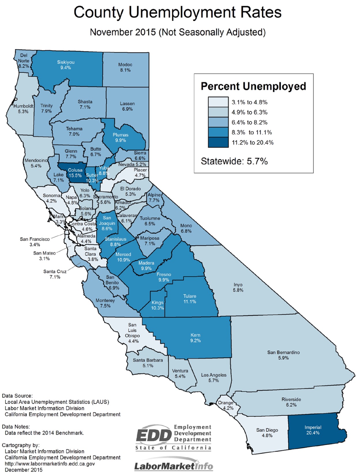 As show in the EDD map below (also available here), much of inland and northern California continues to have higher unemployment rates than coastal California. On a county-by-county basis, unemployment rates ranged from 3.1% in San Mateo County to 20.4% in Imperial County.