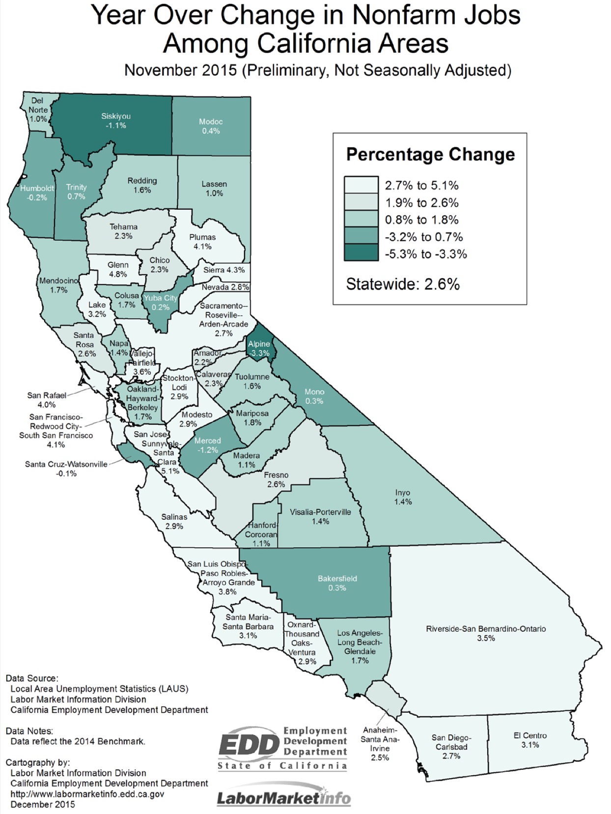 Job Growth by Region. Job growth rates over the past year also have been higher in parts of coastal California (especially the Silicon Valley and the western part of the Bay Area) than in much (but not all) of inland and northern California, as shown in the EDD map below (also available here). In November, the number of nonfarm jobs grew on a non-seasonally adjusted basis in Kern County, which is promising given the declines in the oil sector there over the past year. Meanwhile, the preliminary 1,400 nonfarm job increase in Fresno County was the biggest November jobs bump that area has recorded in years.