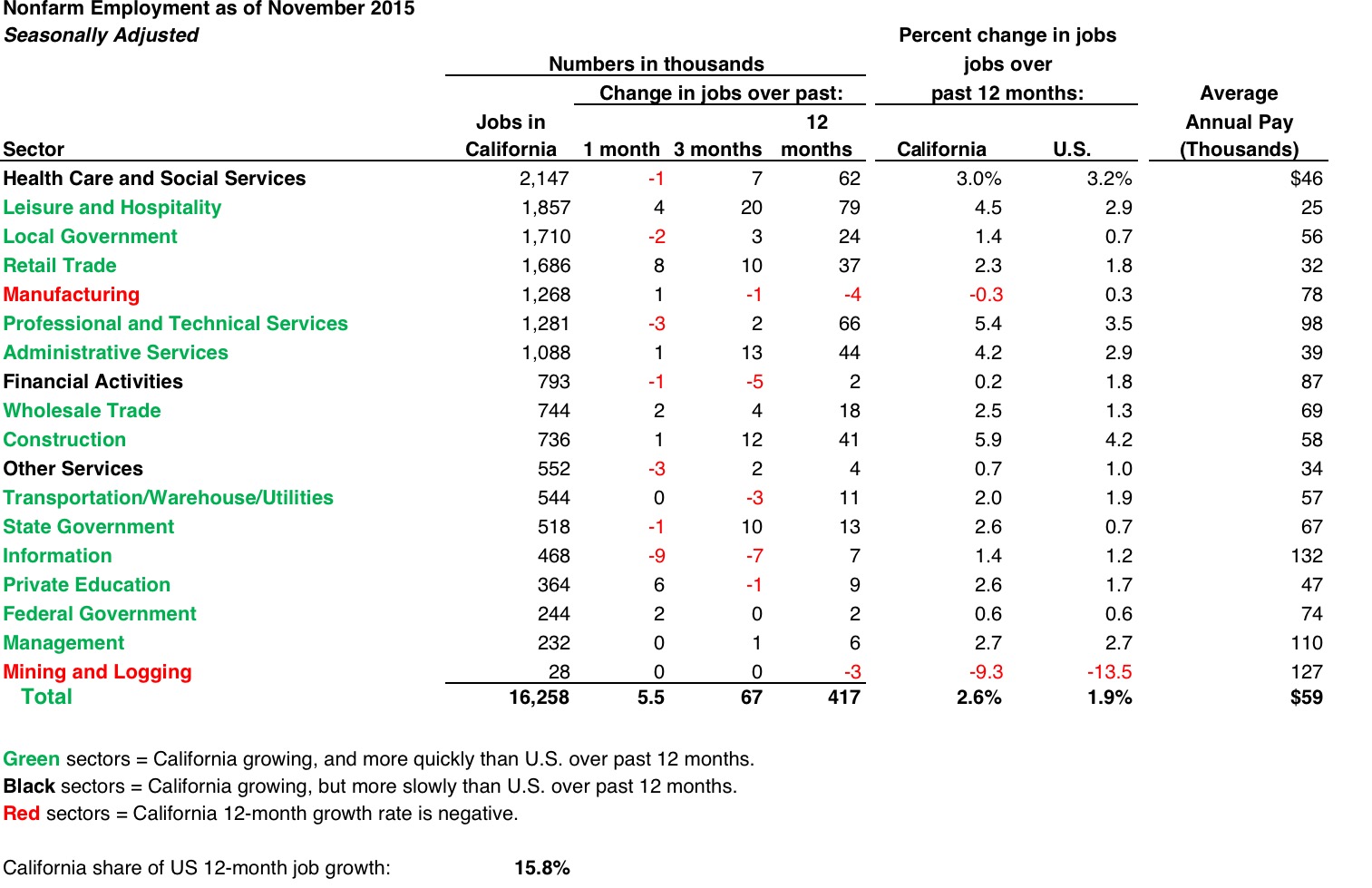 The state's Employment Development Department (EDD) and the U.S. Bureau of Labor Statistics have released preliminary November 2015 jobs data for California. Below, we display some key information from the job report by sector (we describe these key job sectors here). The 13 sectors labeled green are ones in which the rate of job growth in California has exceeded the nation's job growth rate over the past year. The 3 sectors with a black label are ones in which California has seen job growth over the past year, but at a slower rate than the nation. The 2 sectors with a red label are ones in which California has experienced job declines over the past year.