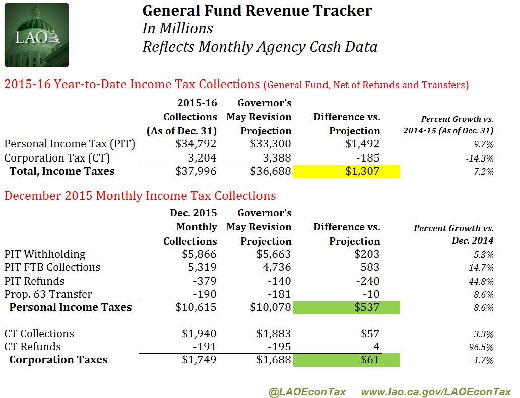 We have received preliminary data from tax agencies concerning California's income tax collections in December 2015. The data indicates that income taxes came in above the Governor's May Revision projections for the month of December. Those May Revision projections essentially were adopted as part of the state's 2015-16 budget package in June 2015. (When the Governor releases his 2016-17 budget proposal on Thursday, January 7, it will, consistent with standard practice, include new revenue projections, thereby rendering the May Revision projections obsolete.)