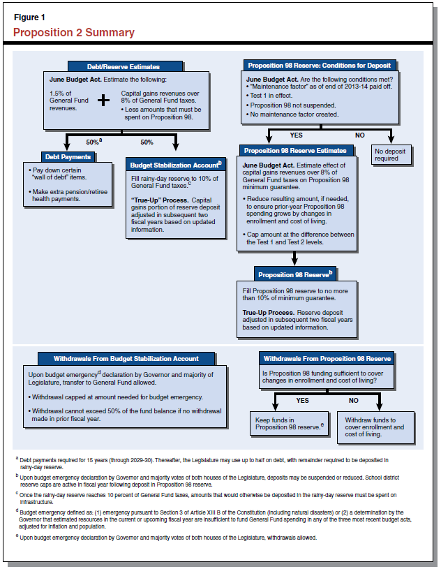 • Highly Complex Interactions With Other Budget Formulas. Proposition 2 is highly complex and will influence key decisions concerning the state’s reserve and debt policies. Due to interactions with the Proposition 98 funding formula for schools and community colleges, Proposition 2 will sometimes produce results that are difficult to predict and counterintuitive. The state will have various choices to make when implementing Proposition 2. We discussed some of those choices in Chapter 4 of our November 2014 Fiscal Outlook publication and in our March 2015 publication on the Governor's Proposition 2 budget proposal. Below is a flow chart summarizing how Proposition 2 works.