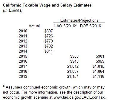 Wages and salaries typically account for about 60% of total revenue from the personal income tax, which is the state government's largest revenue source. In making projections concerning the state budget, both the administration and our office have to consider historical wage and salary data and make estimates about future changes in wages and salaries. This post provides some background on our respective wage and salary estimates, as of the 2016 May Revision.