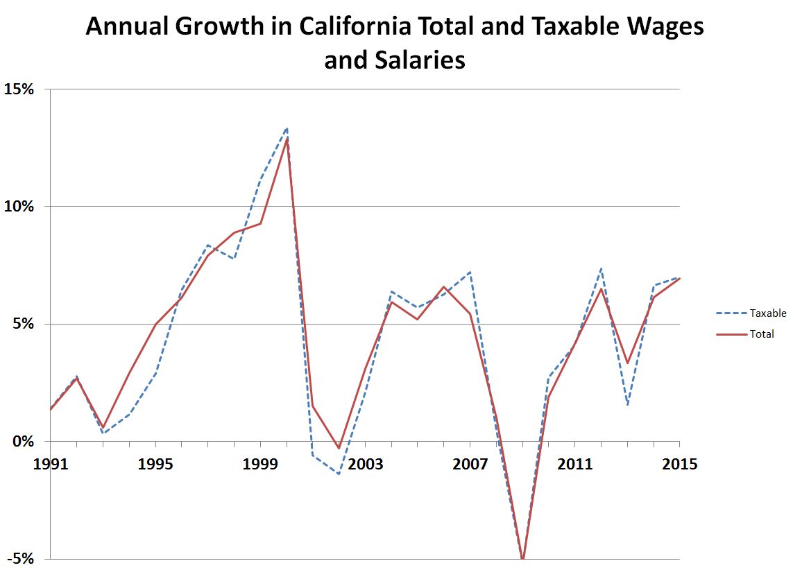 Translating Total Wages and Salaries to Taxable Wages and Salaries. Once we have our annual scenario estimates of growth in total wages and salaries from the quarterly figures described earlier, we then make estimates of what this would mean for growth of taxable wages and salaries based on the historical relationship between the two numbers. As 2014 is the latest year for which the state Franchise Tax Board has hard data, our current growth estimate for 2015 is based on the actual growth rate in total wages and salaries, adjusted (as best we can determine) to "fit" the amount of income tax withholding that the state actually collected in 2015. Projected growth rates for taxable wages and salaries for subsequent years are based solely on projected total wage growth, which we summarized above. The growth rate in taxable wages and salaries is usually within a percentage point or two of the growth rate of total wages and salaries, as shown below.
