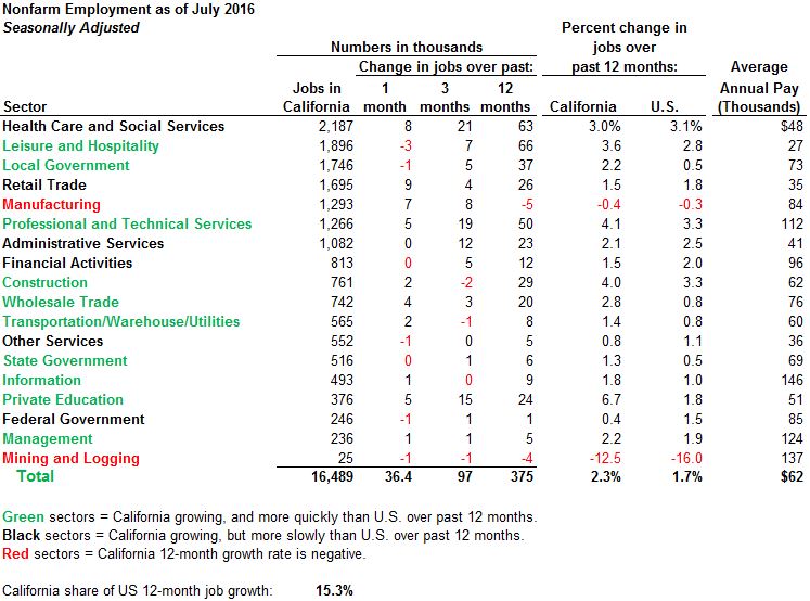 Overall, here are our key observations concerning the state's July 2016 jobs report: