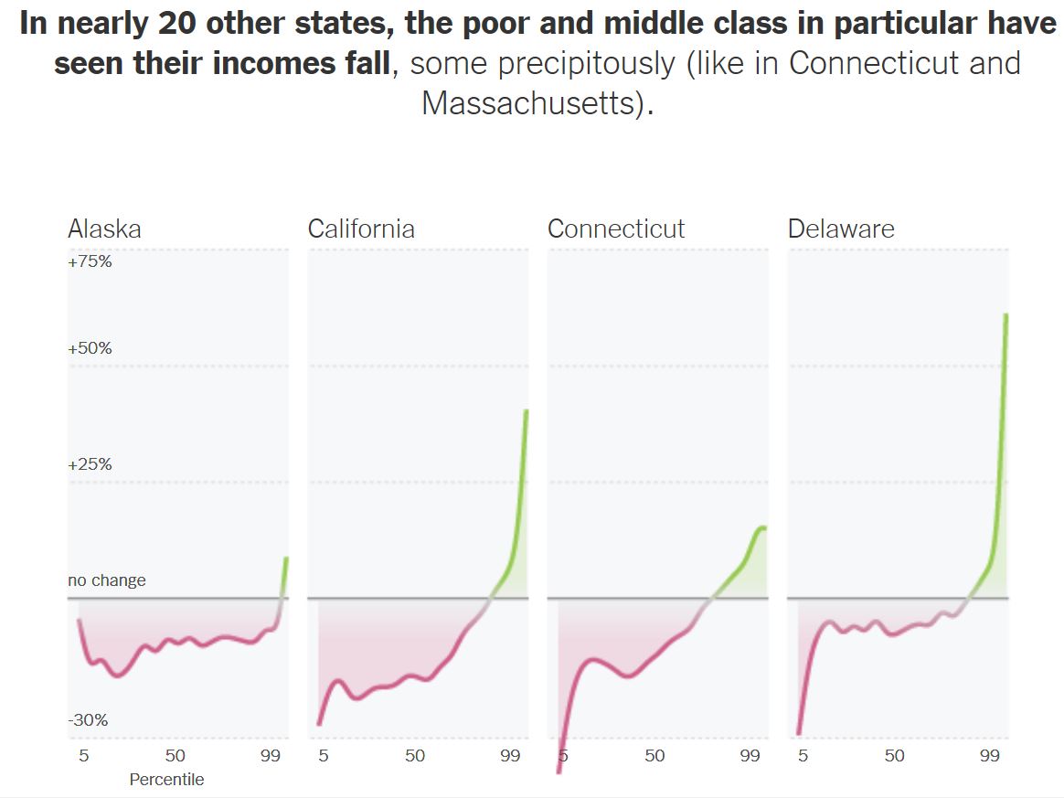 Today, The New York Times—in its online section, Upshot—published a look at Census Bureau data that considers real (inflation-adjusted) income growth by income percentile for each state between 1990 and 2014. That article, written by Quoctrung Bui of The New York Times, is here. Titled "The Geography of U.S. Inequality," the article's subhead promises an answer to the question: "How have the contours of incomes changed, state by state, over the last two decades?"