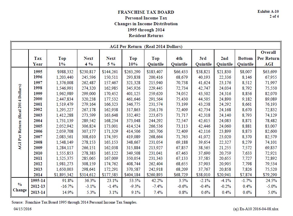 Below is the state Franchise Tax Board data on adjusted gross income per resident tax return, showing how virtually all real growth over the last two decades occurred in the top quintile of returns. As noted above, state tax data lacks good information for low-income households in particular, as many are not required to file tax returns annually.