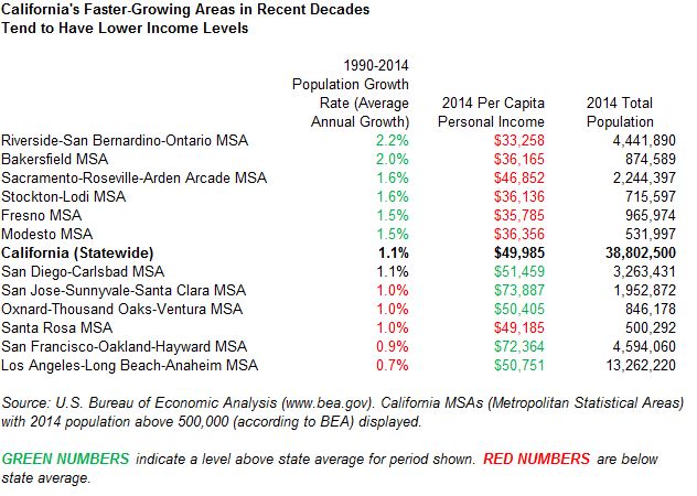 In part, we suspect, due to California's lack of new residential housing supply and resulting high costs in coastal areas, a large portion of California's population growth occurred in areas of the state with incomes below the statewide median since 1990. In 1990, for instance, counties with median income below the state median had about 20% of California's population, but between 1990 and 2014, those counties accounted for 37% of the state's population growth. As shown below, California's faster-growing areas in recent decades tend to have lower income levels.