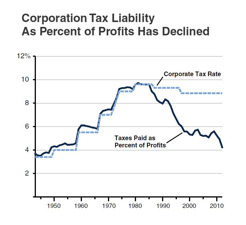 Corporation Tax Liability, As a Percent of Profits, Less Than Half of the Statutory Rate. Across all corporations reporting positive net income, the EATR (displayed above as "taxes paid as percent of profits") was 4.2 percent in 2012, based on May 2014 Franchise Tax Board (FTB) data. This is less than half of today's main 8.84 percent California corporate tax rate and is the lowest corporation tax EATR recorded in California since about 1950. (In 1950, the main corporation tax rate was 4.0 percent, and the EATR was slightly higher in part because of the higher rate paid by banks.) Recent data suggest that in 2013 the EATR may have risen somewhat. (Data on corporation profits and tax liability for 2012 and some prior years is from Exhibit B-2, page 2, of FTB's May 2014 revenue estimating exhibits.)