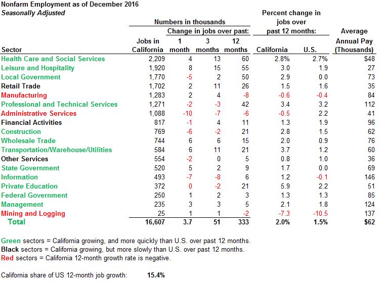 California's state jobs report for December 2016 was released by the state Employment Development Department (EDD) on January 20, 2017. (Because of our office's heavy workload during recent weeks on the state budget, we delayed releasing this brief recap of the December jobs data until now.)