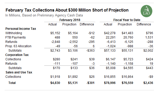 This post describes preliminary collections from the state’s three main taxes—the personal income tax (PIT), sales and use tax, and the corporation tax. Receipts from these three taxes combined fell about $300 million (or 6 percent) short of the administration’s monthly projection. The result was mostly due to the state issuing $295 million more in PIT refunds than was projected. Through February 2018, revenues from these taxes are running $2.4 billion above projections.