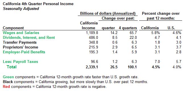 New Personal Income Data. The federal Bureau of Economic Analysis recently published its estimates of state personal income for the 4th quarter of 2017. While the data are subject to revision, they suggest that California’s income grew faster than the rest of the country in 2017. The table below shows growth rates for different income categories in the state and the nation (green categories are areas in which the California 12-month growth rate was faster than the U.S.). These growth rates compare the 4th quarter of 2017 to the 4th quarter of 2016. (Fourth quarter growth rates generally are a more variable measure than the annual average growth rates, which estimate activity in all four quarters.)