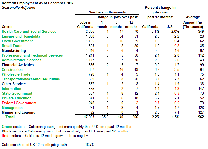 Strong Job Growth. California’s relatively strong wage and salary growth appears to stem largely from its relatively strong job growth. The chart below compares California’s 2017 job growth in different sectors to the nation’s. Among other things, the state’s high paying information sector (which includes the film industry and many technology sector jobs) grew, while the same sector shrank at the national level.