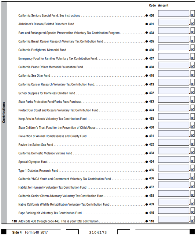 Taxpayers May Donate to Charities When Paying Income Tax. State taxpayers may voluntarily contribute to one or more charitable funds and programs when they file their personal income tax returns. As we show in the below figure, this year's personal income tax return for the 2017 tax year includes 24 of these Voluntary Contribution Funds. Many commonly refer to these as voluntary contribution tax “check-offs.” To contribute to one of these funds or programs, taxpayers specify the amount of money in the box next to the fund or funds to which they want to contribute. Their donations are then subtracted from their refunds or added to the amount owed.