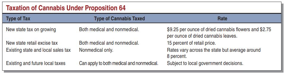In November 2016, California voters approved Proposition 64, which legalized the nonmedical use of cannabis. As seen in the figure, the state levies two excise taxes on cannabis: a retail excise tax and a cultivation tax. (Local governments may levy additional taxes.) These taxes went into effect on January 1, 2018, and the first payments were due on April 30.