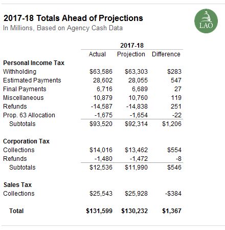Total 2017-18 Tax Collections Exceed Projections. As shown in the table below, final data for PIT and corporation tax collections, as well as preliminary sales tax collections show an increase of $1.3 billion above the final projection for the fiscal year. (Note: The final projection is based on the Department of Finance’s May Revision revenue estimates.) As we have noted in previous months, these actuals are consistent with higher-than-projected totals over the course of the year.