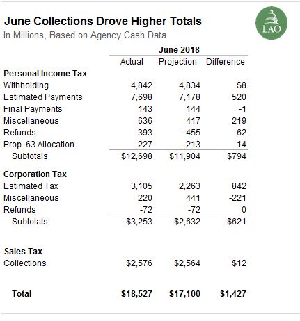 Higher 2017-18 Total Mostly Due to June Collections. As seen in the figure below, June PIT and corporation tax collections drove the majority of the higher 2017-18 totals, with collections almost $1.4 billion above the month’s projections. June PIT collections were 15 percent higher than the prior year and corporation tax collections were 38 percent higher than June 2017.