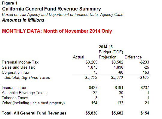 LAO Bottom Line: December/January May Be Key for How Much 2014-15 Revenues Exceed Budget Projections. In our recent Fiscal Outlook, we projected that 2014-15 state revenue collections would exceed the administration's budget act projections by about $2 billion, with expected PIT and CT gains offset by weakness, relative to the budget projections, for SUT and some minor state revenue sources. We also noted the significant likelihood that 2014-15 revenues could be billions of dollars above our projections due to strong asset price (particularly, stock market) trends. Nothing in the November income tax data changes this outlook.