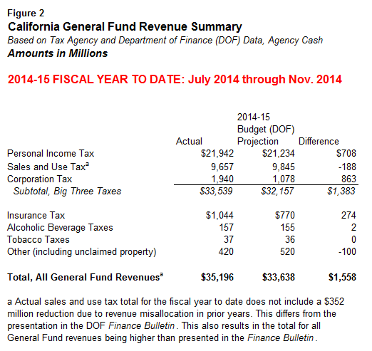 Combined, "Big Three" General Fund Taxes $1.4 Billion Above Budget Projections Through Nov. 30. Figure 2 above displays revenue collection trends attributable to 2014-15 for the fiscal year through November 30. The "Big Three" taxes are running about $1.4 billion above DOF budget act projections. (Our figures, in contrast to those in the Finance Bulletin, adjust 2014-15 sales tax receipts to exclude an approximately $350 million one-time negative adjustment expected to be attributed to prior fiscal years in the state's budget accounting system.) All revenues, including the insurance tax and some other minor revenues, are about $1.6 billion above budget projections through Nov. 30. As noted above, some of the gains in the insurance tax are likely to erode in December.