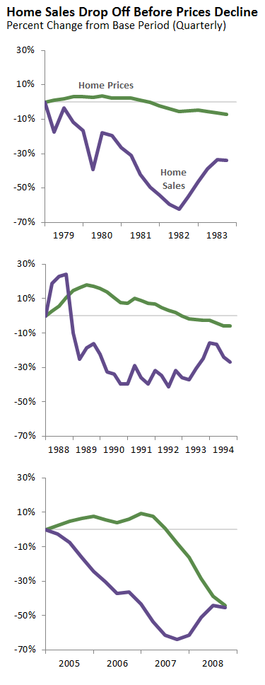 Home sales also are a good barometer for the strength of the state’s housing markets. A major drop in home sales can signal that demand among homebuyers is weakening. This weakening demand can, in turn, lead to falling home prices as home sellers respond by lowering their asking prices. Over last four decades, California has experienced three periods of extended decline in home prices. In each case, home sales started to drop before home prices declined. This can be seen in the figure below, which shows the growth of home prices (adjusted for inflation) and home sales during these past periods of falling prices. For example—looking at the first part of the figure—home sales entered a period of decline in the first quarter of 1979. About a year and a half later (third quarter of 1980) home prices began declining.