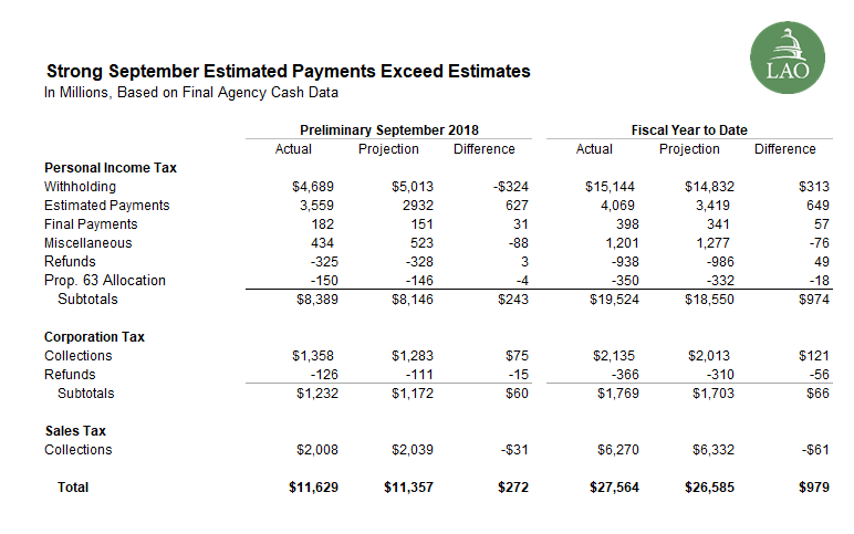 September is not one of the four key months for revenues; however, due to federal filing requirements for individuals and corporations, September can see higher revenues compared to other months. As shown in the table below, the preliminary personal income tax (PIT), corporation tax, and sales tax collections are $272 million above the estimate for September. For the year, collections are running $979 million above the budget act estimates.