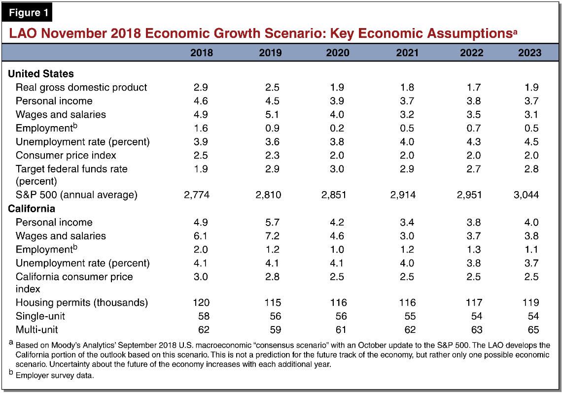 Below are summaries of the key economic assumptions underpinning the economic growth scenario through 2023 in our November 2018 Fiscal Outlook. (The outlook also discusses how state revenues would perform in a hypothetical moderate recession scenario.)