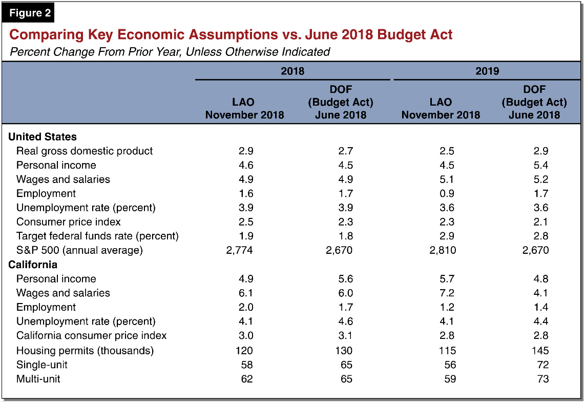 The figure below compares our November 2018 near-term economic assumptions to those reflected in the June 2018 state budget package. (The June budge assumptions were based on the Department of Finance’s May 2018 economic forecast.)