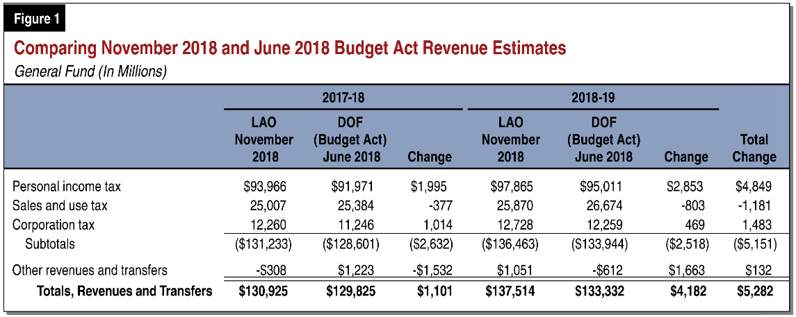 Higher Revenues Across 2017-18 and 2018-19. Figure 1 compares our November 2018 revenue estimates with the administration’s revenue estimates that were incorporated into the June 2018 budget package. As shown below, our estimates of revenues are $5.3 billion higher than budget assumptions across the two years. Our largest difference is in personal income tax (PIT) revenues, which are $4.8 billion higher over the period. This reflects our higher wage growth and capital gains assumptions.