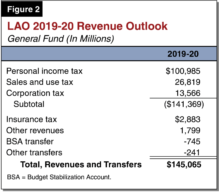 Expect Revenue Growth to Continue in 2019-20. Figure 2 shows our estimates for 2019-20. Consistent with our economic assumptions, General Fund revenues increase by 5.5 percent from 2018-19 to 2019-20. Much of this growth is from the PIT and lower transfers. Continued tightening in the labor market should keep upward pressure on wages and salaries, which make up about two-thirds of taxable income. We expect taxable wages and salaries to increase by 7.2 percent in 2019, but slowing to 4.4 percent in 2020 in part due to slower growth at the national level. While we project continued growth in capital gains revenues in 2018-19, we expect revenues from this source to decline somewhat in 2019-20 due to slow growth in the stock market.