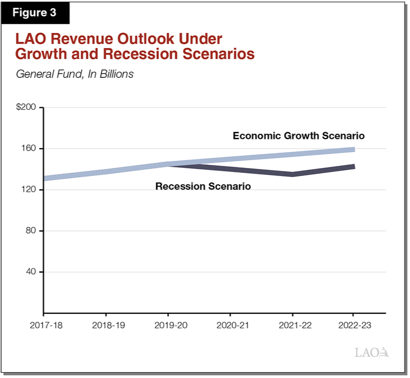 Comparison of Growth Scenario and Recession Scenario. Figure 3 compares our revenue estimates under our economic growth scenario and our recession scenario. Our economic growth scenario is based on the consensus forecast as compiled by Moody’s Analytics. Under our growth scenario, General Fund revenues and transfers grow from $137.5 billion in 2018-19 to $159.3 billion in 2022-23.