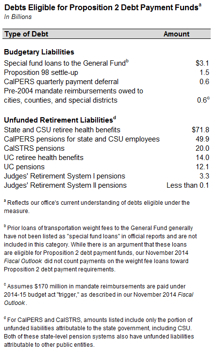Taxes Set Aside by Proposition 2 May Be Key Funding Source for Retiree Health Liabilities. For the next 15 years, Proposition 2—approved by voters last month—sets aside a portion of California's General Fund taxes each year for legislative appropriation toward one or more debt payments specified in the measure. (We call these tax set asides "Proposition 2 debt payments" below.) The figure below lists the major categories of liabilities eligible to be paid from the Proposition 2 debt payments.
