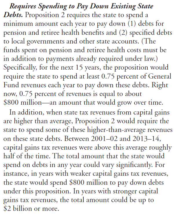 Proposition 2 Debt Payments Mandatory for 15 Years. Proposition 2 requires the state to set aside General Fund tax revenue in reserves and for debt payments. While the reserve payments can be suspended or reduced in certain circumstances (such as when revenue growth is particularly slow), the Proposition 2 debt payments are mandatory for the next 15 years through 2030. In our analysis of Proposition 2 in the November 2014 Voter Information Guide, we described the required debt payments under Proposition 2 as follows: