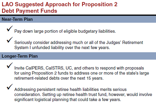 In our November Fiscal Outlook, we suggested that the Legislature adopt the following approach in the coming months as its develops a plan for the Proposition 2 required debt payments: