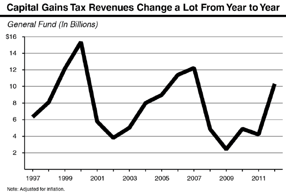 It is important to note, however, that Proposition 2 will not provide this much money every year, since the amount of the measure's required debt payments will fluctuate with the state's capital gains taxes, which, in turn, are driven up and down by trends in stock prices every year. The volatility in capital gains taxes, illustrated below, means that Proposition 2 debt payments will fluctuate up and down over the next 15 years.