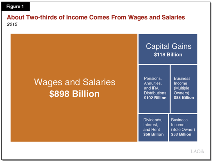 Wage and Salary Income Largest Share of Personal Income. Most workers earning income in California pay state taxes on their wages and salaries. As Figure 1 shows, wages and salaries make up the largest component of the personal income. (Another major source of PIT revenues are capital gains, which we discuss in this post.)