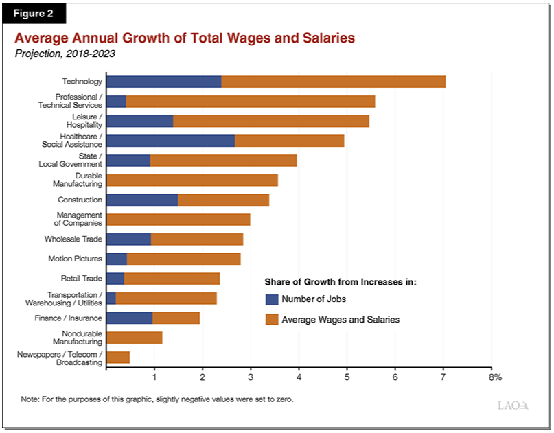 More Wage and Salary Income Growth Expected to Come from Wages, Rather Than Jobs. Figure 2 shows our projections of average annual growth in total wages and salaries, by industry sector, over our outlook period. We project total wage and salary growth will be highest (around 7 percent per year) for workers employed in the technology sector and lowest for workers in print media and telecommunications. The figure also shows what share of total growth in wages and salaries is expected to come from increases in average wages versus increases in the number of jobs. For most industry sectors, it is the latter—overall wage and salary growth is expected to result mostly from average wages, rather than jobs. This means that—mostly—existing workers’ wages are rising rather than additional people gaining employment. As California’s economy nears full employment, we expect job growth to slow and wage growth to remain steady.