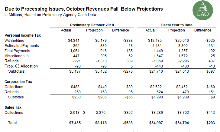 Collections Fall Short of Projections Due to Processing Issues. Due to issues related to withholding timing and the new sales tax IT system, October revenues shown below fall short of projections by $683 million. If those issues were not present, personal income tax (PIT) withholding in October would be $1.3 billion higher and sales tax collections would be $289 million higher. Including these amounts would bring total October collections $932 billion above projections (and the fiscal year to date over $1.9 billion above projections). Instead, these amounts will be counted towards November, likely bringing those totals up significantly.