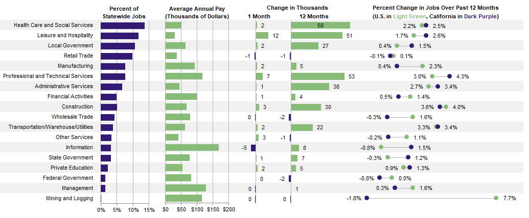 California's Employment Development Department and the U.S. Bureau of Labor Statistics (BLS) recently released California's November 2018 state jobs report. Statewide nonfarm employment grew by an estimated 30,700 in November, another strong showing on the heels of a gain of 36,800 in October. For the third straight month the state's official unemployment rate remained at 4.1 percent, the lowest recorded rate since the series was first established in 1976. The figure below summarizes nonfarm employment by sector based on the monthly survey of employers. Overall employment in the state has grown 1.8 percent over the past 12 months, very close to the nation’s 1.7 percent growth rate.
