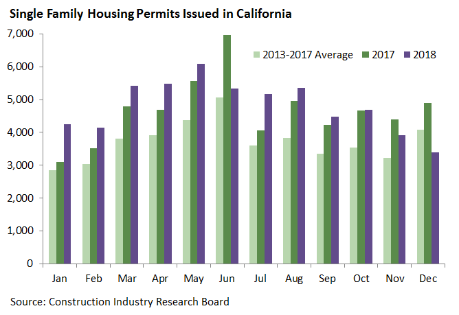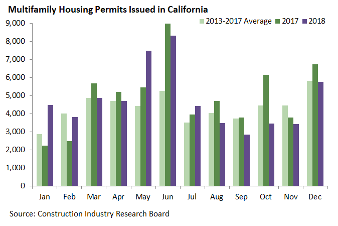Single family homes (57,000) have made up about half of the statewide total this year. December was a weak month for single family permits, falling 30 percent below 2017 levels. This is the second relatively weak month in a row. Overall, single family permitting in 2018 was about on par with 2017.