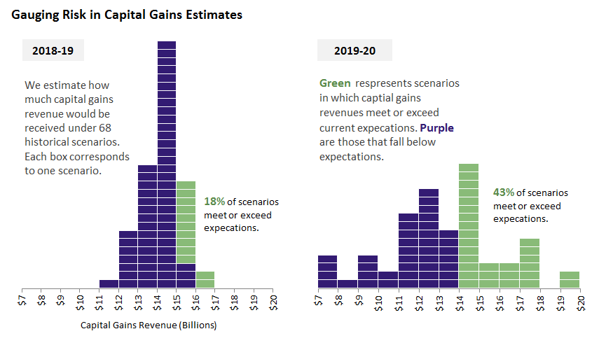 As we discussed in our Overview of the Governor’s Budget, the Governor’s Budget revenue estimates were prepared before a significant drop in stock prices at the end of 2018. As a result, it is not surprising that our analysis suggests that there is a low likelihood that capital gains revenue will meet expectations in 2018-19. Revenues met or exceeded expectations in only one out of five historical scenarios. Chances of hitting the 2019-20 assumptions appear to be somewhat better, with around 40 percent of historical scenarios meeting or exceeding expectations. Nonetheless, there appears to be a significant risk that capital gains revenue will fall below Governor’s Budget assumptions in both 2018-19 and 2019-20. Capital gains revenues fall more than $500 million below expectations in two-thirds of scenarios for 2018-19 and half of scenarios for 2019-20.